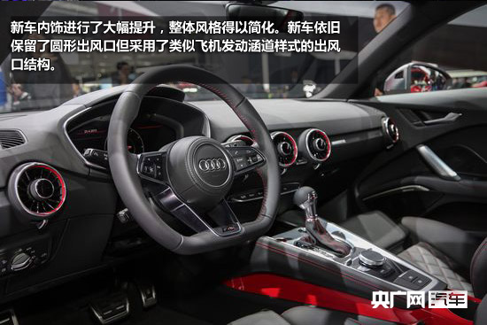 新車(chē)內(nèi)飾進(jìn)行了大幅提升,整體風(fēng)格得以簡(jiǎn)化。新車(chē)依舊保留了圓形出風(fēng)口但采用了類(lèi)似飛機(jī)發(fā)動(dòng)涵道樣式的出風(fēng)口結(jié)構(gòu),可分別控制空調(diào)的開(kāi)關(guān)、風(fēng)速、以及溫度。而側(cè)方的出風(fēng)口則換成了座椅加熱的啟動(dòng)鍵。此外,車(chē)內(nèi)配備了三幅平底方向盤(pán),底部配有TTS專(zhuān)屬徽章。新款TTS將全部信息集成到了駕駛席的12.3寸顯示系統(tǒng)上,MMI液晶顯示屏的功能被取代。
