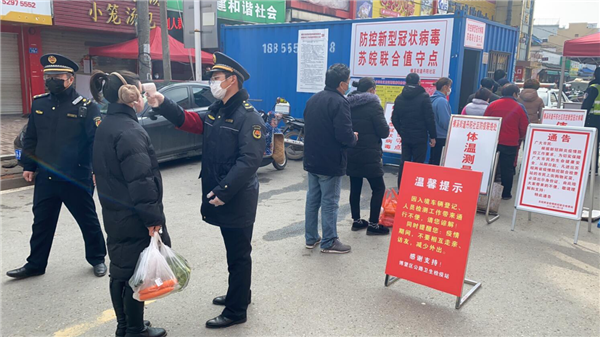 馬鞍山市博望區(qū)丹陽(yáng)農(nóng)貿(mào)市場(chǎng)作為皖蘇兩省丹陽(yáng)南北兩鎮(zhèn)唯一的農(nóng)貿(mào)市場(chǎng),每天跨省購(gòu)物的人流量較大,人員群體復(fù)雜。為了有效防控疫情,江寧區(qū)和博望區(qū)兩地城管開(kāi)展聯(lián)動(dòng)合作,在兩省交界處丹陽(yáng)農(nóng)貿(mào)市場(chǎng)門(mén)口設(shè)置蘇皖兩省聯(lián)合疫情防控點(diǎn)。