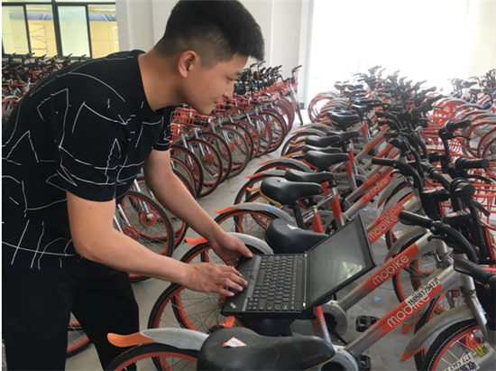 摩拜的工作人員正在用電腦檢測(cè)車輛