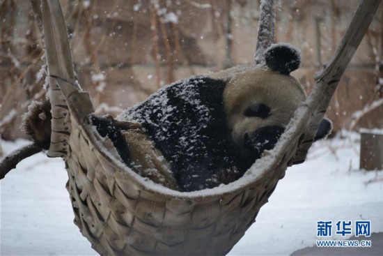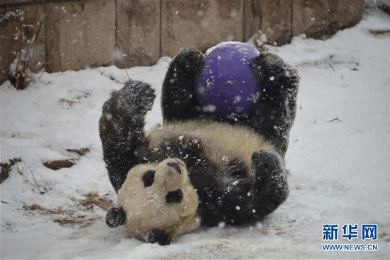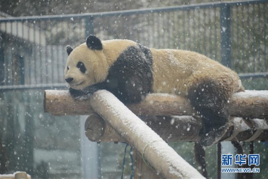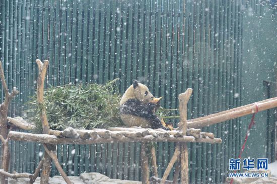 當(dāng)日,北京迎來降雪,北京動(dòng)物園的大熊貓?jiān)谘┲墟覒蛉鰵g兒。