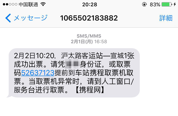 春節(jié)前,為防止春運期間回家不好買票,不確定哪天才能返鄉(xiāng)的潘女士,早早地通過攜程網(wǎng),購買了3張從上海到安徽宣城的汽車票。潘女士說,2月2日當(dāng)天換票,輸入攜程提供的短信驗證碼后,發(fā)現(xiàn)只有一張票可以出。