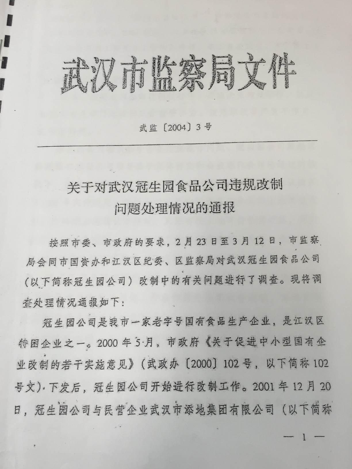 2004年武漢市紀(jì)委對(duì)冠生園違規(guī)改制的認(rèn)定