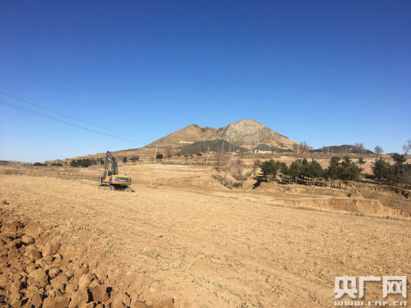 通遼市奈曼旗土城子鄉(xiāng)平頂山村,大型機(jī)械正在平整土地。徐秀春拿著鐵锨,把挖掘機(jī)壓過(guò)的硬塊鏟平。