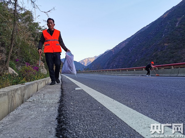 楊文忠在公路清潔養(yǎng)護(hù)(中央廣播電視總臺(tái)央廣記者 李騰飛 攝)
