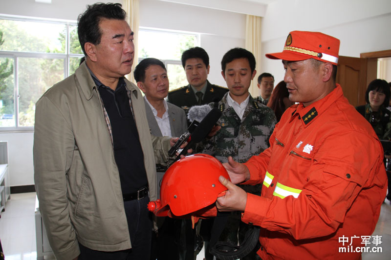 武警云南森林總隊(duì)騰沖中隊(duì)指導(dǎo)員向記者團(tuán)介紹滅火作戰(zhàn)服 中廣軍事記者劉鵬攝