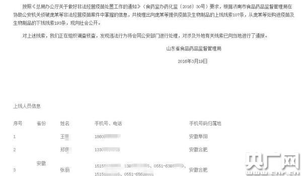 據(jù)悉,國家食藥監(jiān)總局18號局責成山東省食藥監(jiān)局會同公安和衛(wèi)生計生部門,立即查清疫苗等相關產(chǎn)品的來源和流向,并第一時間向社會公開相關信息。19號,山東省食藥監(jiān)局就公開了上下線人的準確姓名和詳細電話。