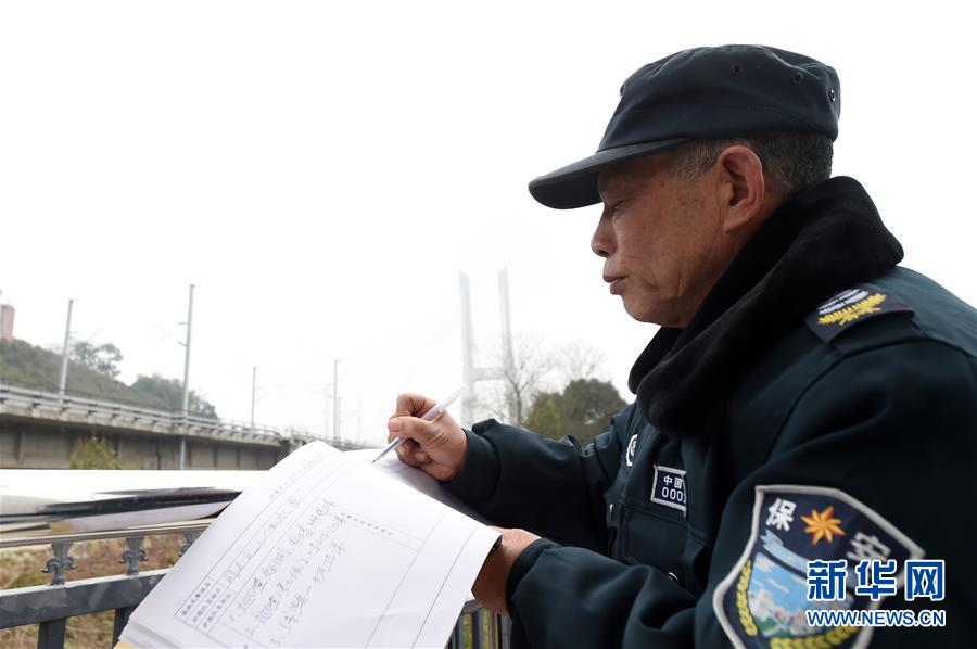 護路隊員伍勇春在位于新白沙沱長江特大橋旁的治安崗?fù)?nèi)填寫巡查日志(2月6日攝)。今年已經(jīng)60歲的伍勇春是川黔鐵路線上的一名護路隊員,他常年駐守在橫跨于長江之上的白沙沱大橋旁,巡查線路隱患、提醒過往行人安全,被附近居民親切地稱為“守橋人”。2018年1月25日渝貴鐵路通車,與白沙沱大橋并行的新白沙沱長江特大橋同期投入使用,該橋是雙層六線鋼桁梁鐵路斜拉橋,也是渝貴鐵路線上的重要節(jié)點工程。為了保障新橋的安全運行,擁有豐富守橋護橋工作經(jīng)驗的伍勇春又被招為渝貴鐵路護路隊員,和他的團隊同時承擔(dān)起新舊兩座鐵路大橋的護衛(wèi)工作。新白沙沱長江特大橋擁有上下兩層總共6條客運、貨運鐵路線,伍勇春不僅要時刻巡查防止行人、動物進入大橋,還要經(jīng)常進入尚未投入運營的下層貨運鐵路線巡視安全、檢查設(shè)施設(shè)備是否正常。同時,伍勇春還要不時返回白沙沱大橋提醒過橋行人注意通行安全。工作量增加了,伍勇春卻從未抱怨過一句。在伍勇春看來,保障行人旅客安全、維護鐵路春運暢通是他這位“守橋人”應(yīng)盡的職責(zé)。新華社記者 唐奕 攝 -