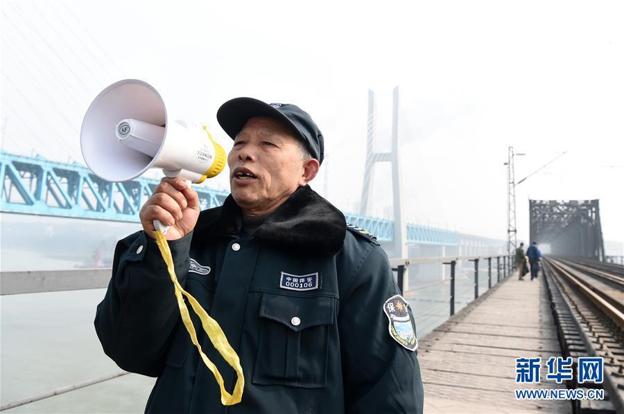 伍勇春在白沙沱大橋上用喊話器提醒過往行人注意安全,他身后(圖片左側(cè))就是渝貴鐵路線上的新白沙沱長江特大橋(2月6日攝)。今年已經(jīng)60歲的伍勇春是川黔鐵路線上的一名護路隊員,他常年駐守在橫跨于長江之上的白沙沱大橋旁,巡查線路隱患、提醒過往行人安全,被附近居民親切地稱為“守橋人”。2018年1月25日渝貴鐵路通車,與白沙沱大橋并行的新白沙沱長江特大橋同期投入使用,該橋是雙層六線鋼桁梁鐵路斜拉橋,也是渝貴鐵路線上的重要節(jié)點工程。為了保障新橋的安全運行,擁有豐富守橋護橋工作經(jīng)驗的伍勇春又被招為渝貴鐵路護路隊員,和他的團隊同時承擔(dān)起新舊兩座鐵路大橋的護衛(wèi)工作。新白沙沱長江特大橋擁有上下兩層總共6條客運、貨運鐵路線,伍勇春不僅要時刻巡查防止行人、動物進入大橋,還要經(jīng)常進入尚未投入運營的下層貨運鐵路線巡視安全、檢查設(shè)施設(shè)備是否正常。同時,伍勇春還要不時返回白沙沱大橋提醒過橋行人注意通行安全。工作量增加了,伍勇春卻從未抱怨過一句。在伍勇春看來,保障行人旅客安全、維護鐵路春運暢通是他這位“守橋人”應(yīng)盡的職責(zé)。新華社記者 唐奕 攝 -