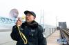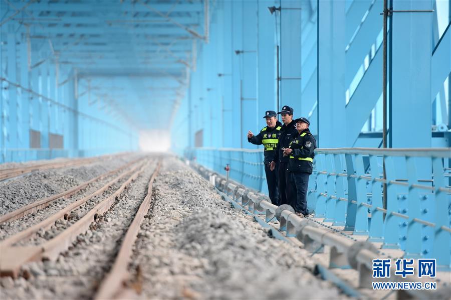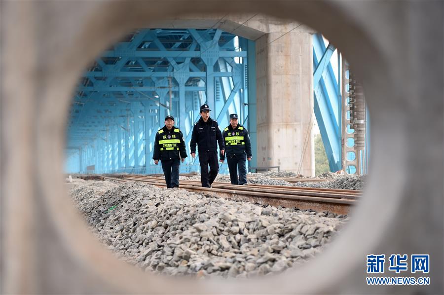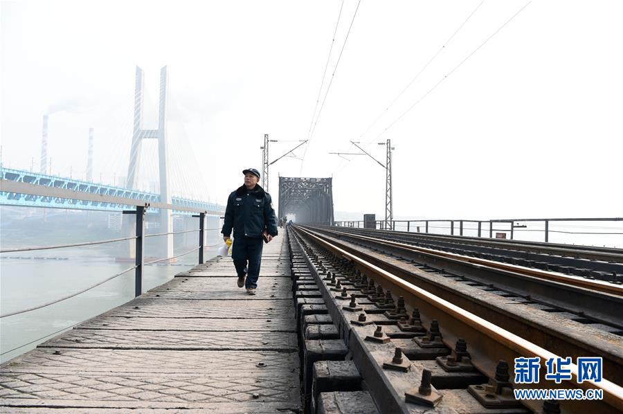 伍勇春在白沙沱大橋上巡查(2月6日攝)。今年已經(jīng)60歲的伍勇春是川黔鐵路線上的一名護路隊員,他常年駐守在橫跨于長江之上的白沙沱大橋旁,巡查線路隱患、提醒過往行人安全,被附近居民親切地稱為“守橋人”。2018年1月25日渝貴鐵路通車,與白沙沱大橋并行的新白沙沱長江特大橋同期投入使用,該橋是雙層六線鋼桁梁鐵路斜拉橋,也是渝貴鐵路線上的重要節(jié)點工程。為了保障新橋的安全運行,擁有豐富守橋護橋工作經(jīng)驗的伍勇春又被招為渝貴鐵路護路隊員,和他的團隊同時承擔(dān)起新舊兩座鐵路大橋的護衛(wèi)工作。新白沙沱長江特大橋擁有上下兩層總共6條客運、貨運鐵路線,伍勇春不僅要時刻巡查防止行人、動物進入大橋,還要經(jīng)常進入尚未投入運營的下層貨運鐵路線巡視安全、檢查設(shè)施設(shè)備是否正常。同時,伍勇春還要不時返回白沙沱大橋提醒過橋行人注意通行安全。工作量增加了,伍勇春卻從未抱怨過一句。在伍勇春看來,保障行人旅客安全、維護鐵路春運暢通是他這位“守橋人”應(yīng)盡的職責(zé)。新華社記者 唐奕 攝
