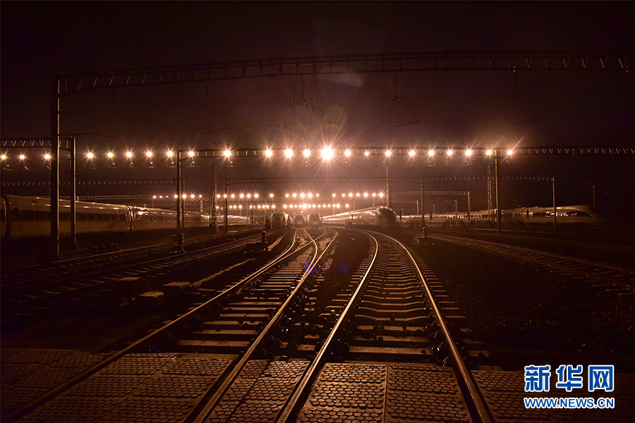 凌晨,重慶西動車運用所存車場,檢修后的動車組就停放這里。新華網(wǎng)發(fā)(陳亞 攝)