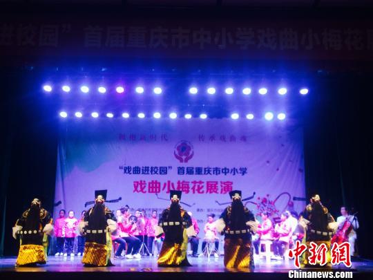 圖為“戲曲進(jìn)校園”首屆重慶市中小學(xué)戲曲小梅花展演決賽現(xiàn)場!$娦 攝