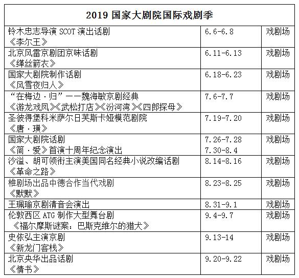 2019國家大劇院國際戲劇季特別策劃三大主題演出板塊:“泱泱國風(fēng)”、“愛的真諦”、“環(huán)環(huán)相扣”。其中,“泱泱國風(fēng)”弘揚(yáng)國粹文化,一展華夏風(fēng)采。國家大劇院制作話劇《風(fēng)雪夜歸人》,以一代名伶的自我覺醒,低吟淺唱一曲民國年間的梨園悲歌。北京風(fēng)雷京劇團(tuán)京味話劇《緙絲箭衣》,別出心裁從舊時(shí)戲裝租賃老店的故事入手,描繪梨園行里的匠人情懷。由京劇名家魏海敏、朱強(qiáng)聯(lián)袂演繹京劇經(jīng)典系列《在梅邊·歸》,精選三出傳承百年、久演不衰的經(jīng)典戲碼《游龍戲鳳》《汾河灣》《四郎探母》,傳遞最原汁原味的國粹神韻。人稱“瑜老板”的王珮瑜是當(dāng)今京劇舞臺(tái)上極具人氣的當(dāng)紅名家,由她主演的京劇“清音會(huì)”融入更多時(shí)尚元素,吸引越來越多年輕人關(guān)注國粹藝術(shù)。京劇名家史依弘也將帶來新編武俠京劇《新龍門客!,在原作基礎(chǔ)上進(jìn)行大膽的戲曲化革新,將傳統(tǒng)俠義精神在戲曲中發(fā)揮到極致。