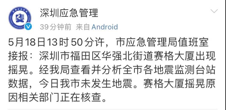 據(jù)網(wǎng)友反映,深圳賽格大廈從中午12點(diǎn)開始輕微晃動,到1點(diǎn)多晃動明顯,讓人有頭暈感。