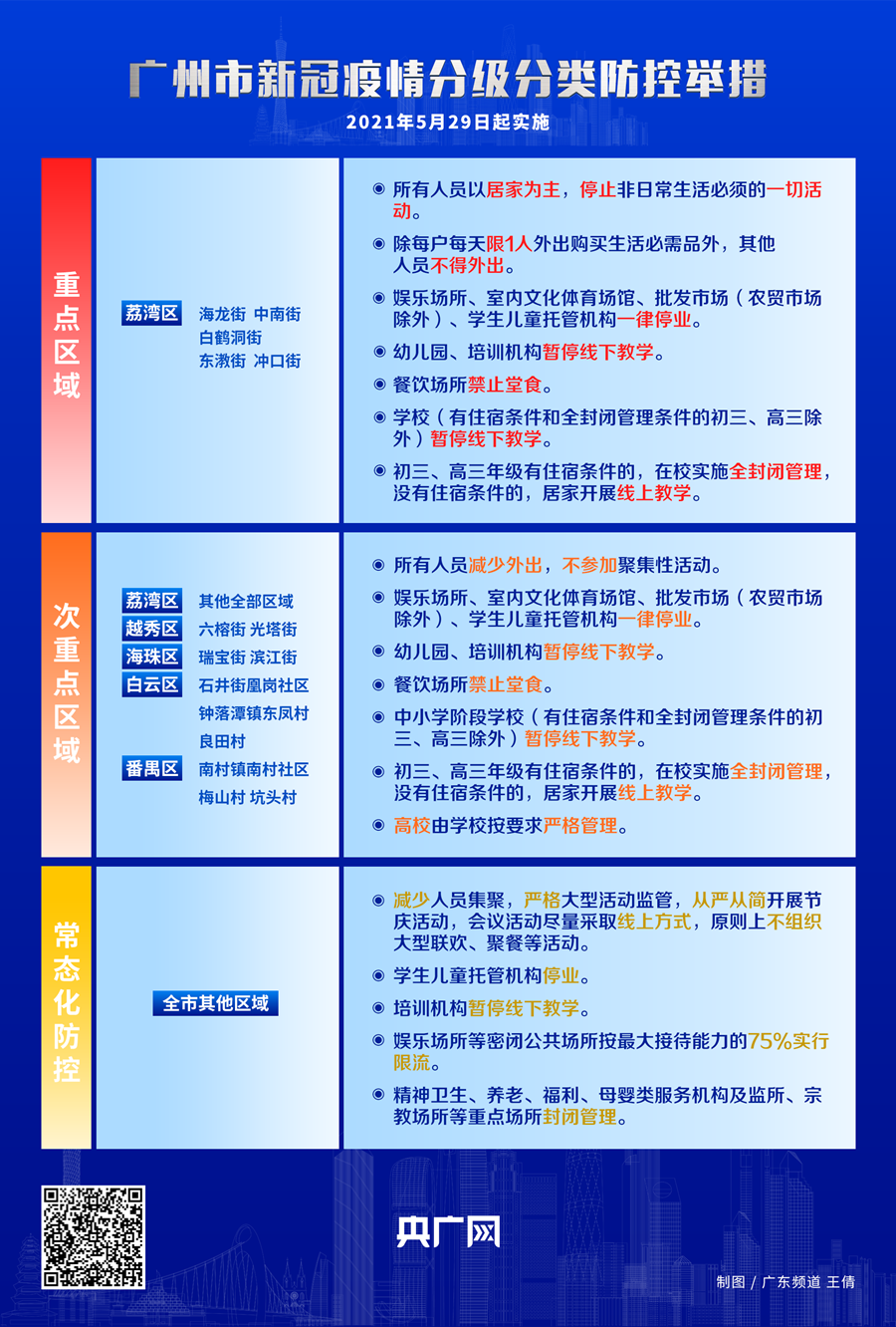 央廣網(wǎng)廣州5月29日消息(記者 張勝?gòu)?qiáng)、官文清、黃璐璐、王倩)今天早上8點(diǎn)15分,廣州緊急發(fā)布關(guān)于新冠肺炎疫情分級(jí)分類防控工作的通告,明確將嚴(yán)格管控重點(diǎn)區(qū)域,強(qiáng)化管理次重點(diǎn)區(qū)域,狠抓常態(tài)化防控。