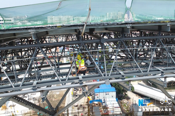 吊裝工人站在狹窄的主檁條上進(jìn)行吊掛檁條的焊接施工。新華網(wǎng) 伍嘉煒攝