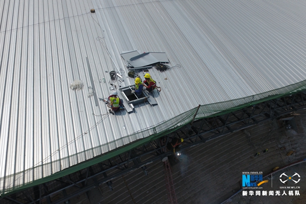 為準(zhǔn)備體育場屋面吊頂施工,吊裝工人正在安裝吊頂構(gòu)件。新華網(wǎng) 伍嘉煒攝
