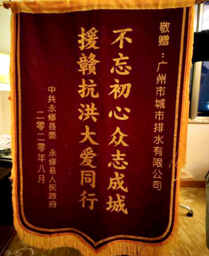中共永修縣委、永修縣人民政府也給廣州水投集團(tuán)廣州排水公司贈(zèng)送了“不忘初心眾志成城 援贛抗洪大愛同行”的錦旗。