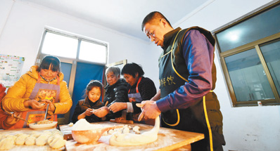2018年,山西省聞喜縣張才嶺村的7戶貧困家庭搬遷到新村的“幸福小院”,組成“大家庭”。在全村脫貧后的第一個春節(jié),第一書記牛方平(右一)和“幸福小院”的村民一起包餃子。