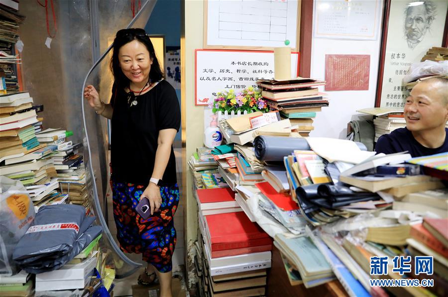 7月13日,一名讀者(左)走進復(fù)旦舊書店。 在上海楊浦區(qū)政肅路一家菜市場的樓上,有一家專門經(jīng)營舊書的書店,67平方米的空間外加半環(huán)繞的閣樓上,近五萬本各類書籍將必要通道以外的所有空間占滿,空氣中彌漫著舊書特有的氣息。書店的主人是來自江蘇鹽城的張強夫婦。從2002年開店至今,這家只出售舊書的書店靠著愛書人的口耳相傳,漸漸有了點名氣。張強介紹說,曾經(jīng)也想給書店起一個有點內(nèi)涵的名字,但因為開在復(fù)旦大學(xué)生活區(qū)內(nèi),又是經(jīng)營舊書的,大家口中的“復(fù)旦舊書店”這個名字就被沿用了下來。 復(fù)旦舊書店里的書籍,從漫畫書到工具書,品類繁雜應(yīng)有盡有。這里的書籍沒有分類,是因為張強想讓讀者在有限空間里看到更多不同種類的書籍,既為來到這里的讀者找書,也為這里的書找讀者。 新華社記者 方喆 攝