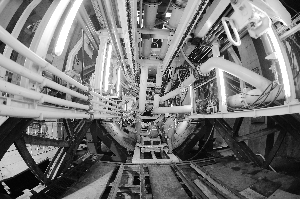 在盾構(gòu)機頭部,也就是盾構(gòu)主機的后方,四五名技術(shù)人員正在拼裝隧道管片,這些重達3.2噸的圓弧形混凝土被龍門吊吊至盾構(gòu)機后部的小車廂內(nèi),一節(jié)節(jié)車廂再沿著盾構(gòu)機上窄窄的軌道送至主機附近,掛在連接橋上的大鉤子接著將管片吊起,滑至主機后方后放置到可以旋轉(zhuǎn)的機器上。技術(shù)人員將管片用巨大的螺帽固定,機器向上旋轉(zhuǎn),再固定下一塊管片,大小不一的6塊管片全部固定后,形成一個閉合的圓環(huán)。