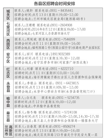 央廣網(wǎng)蘭州8月8日消息 8月5日,蘭州市人社局發(fā)布《 2016年蘭州市引導(dǎo)高校畢業(yè)生進(jìn)企業(yè)服務(wù)雙向?qū)訉?zhuān)場(chǎng)招聘會(huì)公告》 :蘭州市8個(gè)縣區(qū)及高新區(qū)將于近期舉辦引導(dǎo)高校畢業(yè)生進(jìn)企業(yè)服務(wù)雙向?qū)訉?zhuān)場(chǎng)招聘活動(dòng),全市共有880名高校畢業(yè)生引導(dǎo)到各類(lèi)企業(yè)服務(wù)。