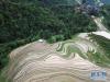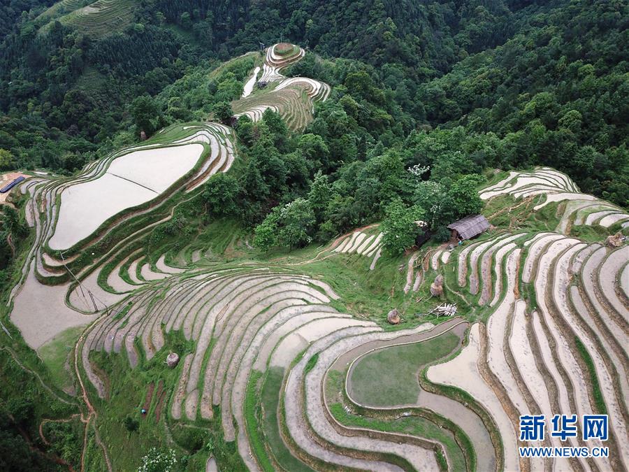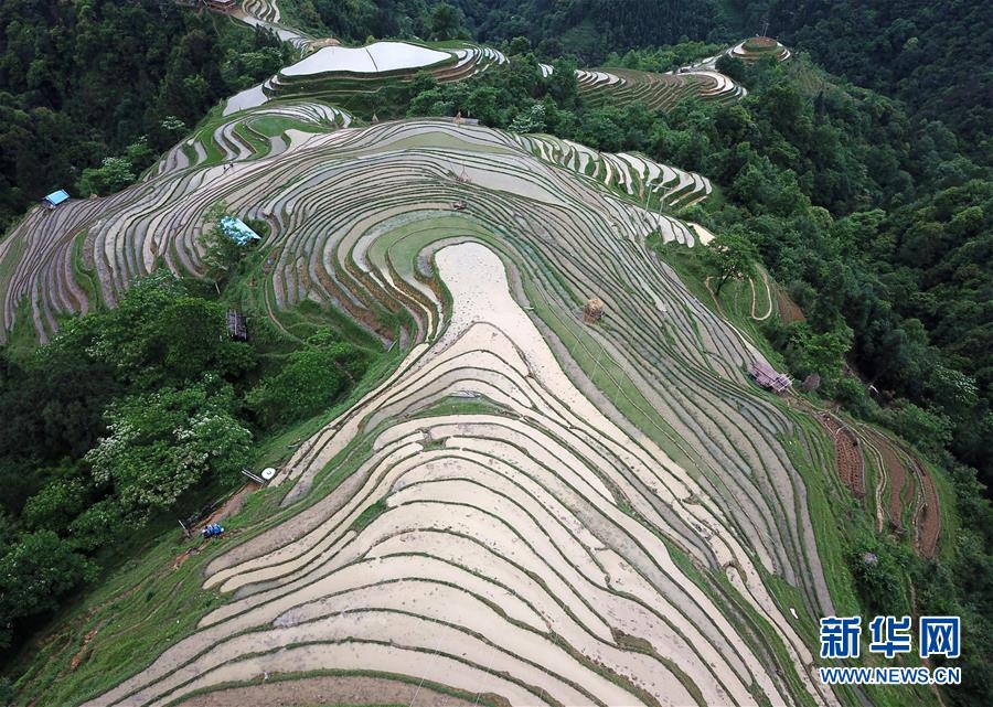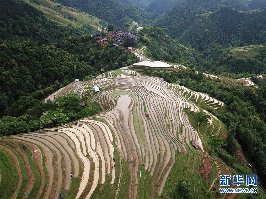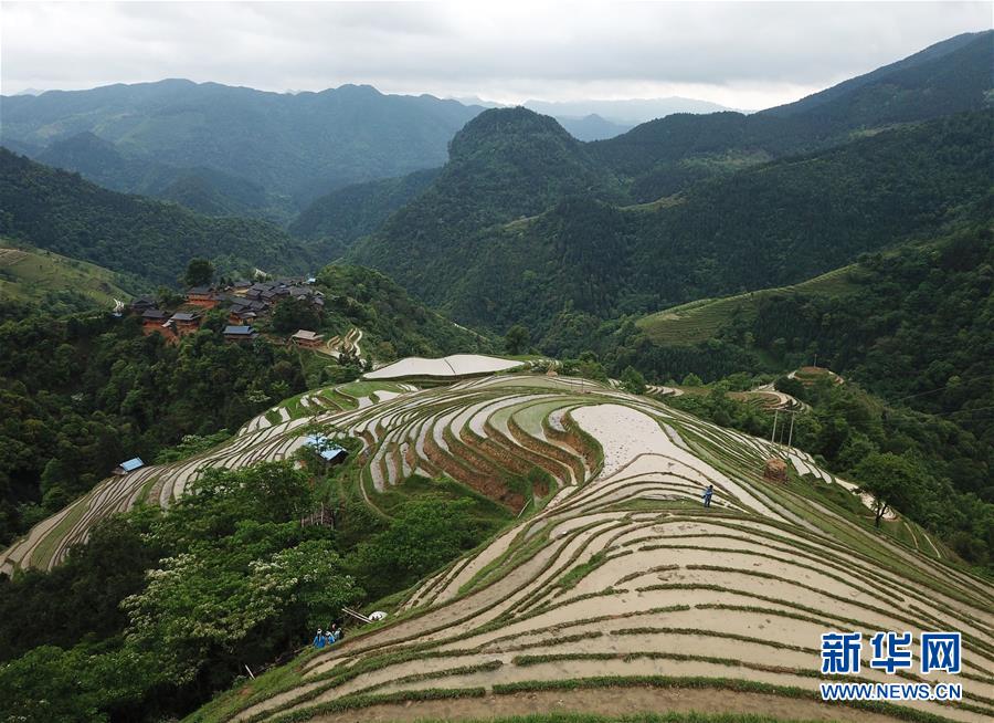 5月7日在貴州省榕江縣計(jì)劃鄉(xiāng)陽(yáng)開(kāi)苗寨拍攝的苗寨梯田景觀(無(wú)人機(jī)拍攝)。初夏時(shí)節(jié),位于貴州省黔東南苗族侗族自治州榕江縣計(jì)劃鄉(xiāng)的陽(yáng)開(kāi)苗寨層層疊疊的梯田與古樸的苗寨木樓相互映襯,美如畫(huà)卷。新華社發(fā)(楊文斌攝) -