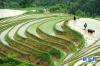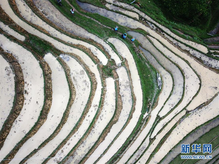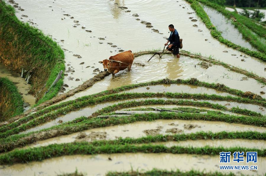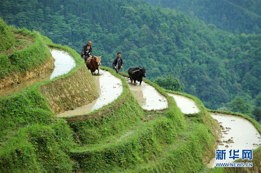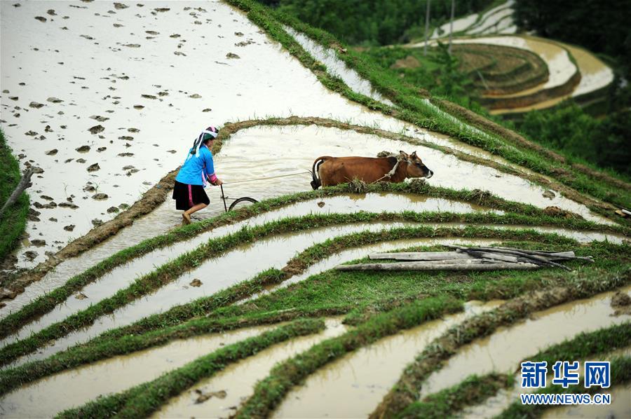 5月7日,貴州省榕江縣計(jì)劃鄉(xiāng)陽(yáng)開(kāi)苗寨的苗族群眾在耕田。初夏時(shí)節(jié),位于貴州省黔東南苗族侗族自治州榕江縣計(jì)劃鄉(xiāng)的陽(yáng)開(kāi)苗寨層層疊疊的梯田與古樸的苗寨木樓相互映襯,美如畫(huà)卷。新華社發(fā)(楊文斌攝) -