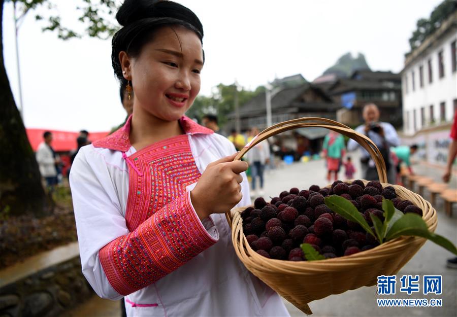 6月3日,一名苗族姑娘在楊梅節(jié)上展示楊梅。當(dāng)日,貴州省黔東南苗族侗族自治州榕江縣高文苗寨舉辦楊梅節(jié),吸引眾多游客參加“楊梅大王”評選、吃楊梅比賽、吹蘆笙、跳蘆笙舞等趣味活動(dòng)。新華社發(fā)(王炳真 攝) -