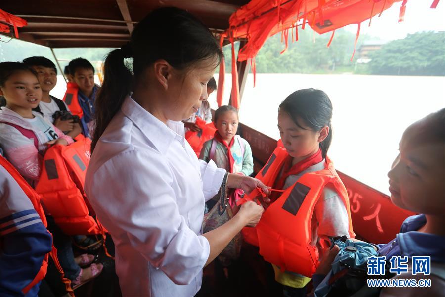 6月22日,八吉小學(xué)老師幫助登船渡江的學(xué)生穿救生衣。近日,貴州省榕江縣進(jìn)入汛期。連日降雨過后,為保障學(xué)生安全,該縣位于都柳江畔的八吉小學(xué)22日趕在上游洪峰來臨前緊急下課。240余名學(xué)生在全校教職員工保護(hù)下登船渡江,安全回家。八吉小學(xué)目前在校學(xué)生399名,其中240多人家住都柳江對(duì)岸。建校27年來,每至汛期,學(xué)校都會(huì)安排教師值班,護(hù)送學(xué)生過江。新華社記者歐東衢攝