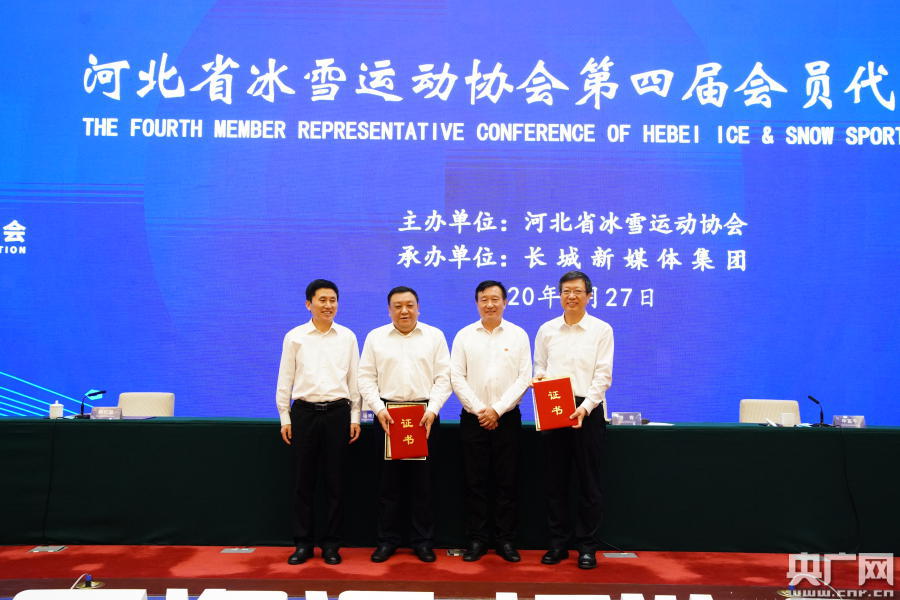新當(dāng)選的河北省冰雪運(yùn)動協(xié)會主席馬來順(左二)接受證書(央廣網(wǎng)發(fā) 許付磊 攝)