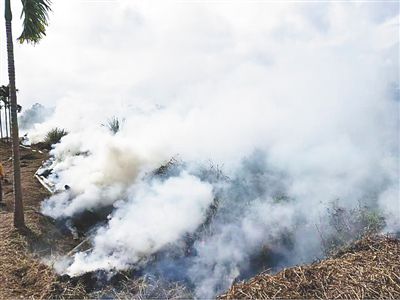 、呗(lián)合執(zhí)法組在萬寧某地發(fā)現(xiàn)農(nóng)戶焚燒秸稈產(chǎn)生大量濃煙。