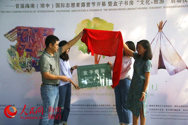 瓊中黎族苗族自治縣政府副縣長冷毅,木舍耕讀創(chuàng)辦人、“創(chuàng)意進(jìn)村”計(jì)劃發(fā)起人秦加一為盒子書房揭牌