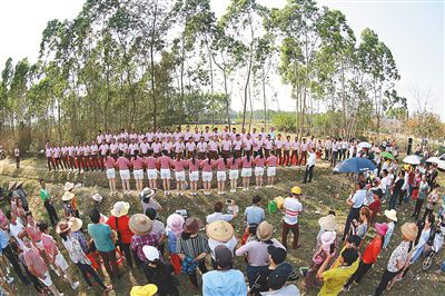 2月19日,在儋州市光村鎮(zhèn)的一處橡膠林里,當?shù)卮迕衽牌痖L隊唱起調聲,慶祝元宵佳節(jié)。 海南日報記者 陳元才 通訊員 朱鼎甲 攝