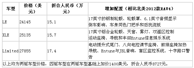 編輯點(diǎn)評(píng):新款RAV4將于明年1月在北美地區(qū)上市,那么國(guó)產(chǎn)版在明年一季度應(yīng)該就會(huì)有確切消息,很可能一季度就會(huì)上市,最遲也將在明年的上海車(chē)展上市。北美版的車(chē)型配置參考意義不大,不過(guò)2.5L發(fā)動(dòng)機(jī)很有可能取代現(xiàn)款的2.4L發(fā)動(dòng)機(jī),2.0L車(chē)型必然會(huì)保留。