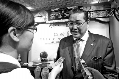 昨天下午3時(shí)許,論壇結(jié)束。泰國(guó)前副總理素拉杰走出會(huì)場(chǎng),穿過(guò)大宋官窯展廳時(shí),被媒體攔下群訪,并回答了記者的提問(wèn)。