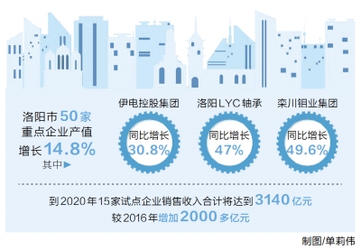 根據(jù)《意見》,洛陽市依托現(xiàn)代產(chǎn)業(yè)體系發(fā)展規(guī)劃,從全市先進(jìn)裝備制造、新材料及有色金屬、高端石油化工、新能源、生物醫(yī)藥等產(chǎn)業(yè)中選取中信重工、洛陽LYC軸承、普萊柯生物等15家重點企業(yè)作為試點,開展提質(zhì)倍增行動。根據(jù)洛陽市政府公布的《洛陽市重點企業(yè)提質(zhì)倍增試點行動計劃表》,到2020年這15家試點企業(yè)銷售收入合計將達(dá)到3140億元,較2016年增加2000多億元。