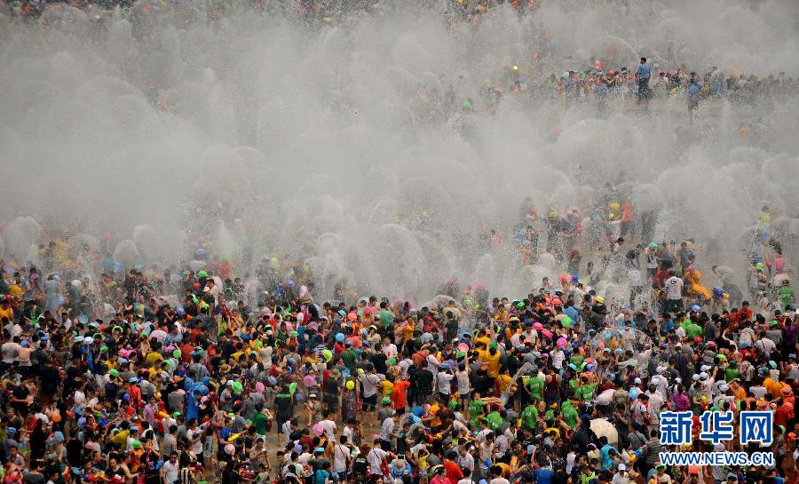 央廣網(wǎng)河南分網(wǎng)消息 據(jù)新華網(wǎng)報道:4月15日,數(shù)萬名當?shù)厝罕姾陀慰驮谠颇鲜∥麟p版納州景洪市潑水廣場上潑水狂歡。當日是2014年西雙版納潑水節(jié),也是傣歷1376年新年節(jié)系列活動的最后一天,數(shù)萬名當?shù)厝罕姶┥瞎?jié)日盛裝,和外地游客一起在云南省西雙版納傣族自治州景洪市互相潑水,互祝吉祥、幸福、健康。潑水節(jié)是傣族人民送舊迎新的傳統(tǒng)節(jié)日,已有上千年歷史。(新華社記者 藺以光 攝)