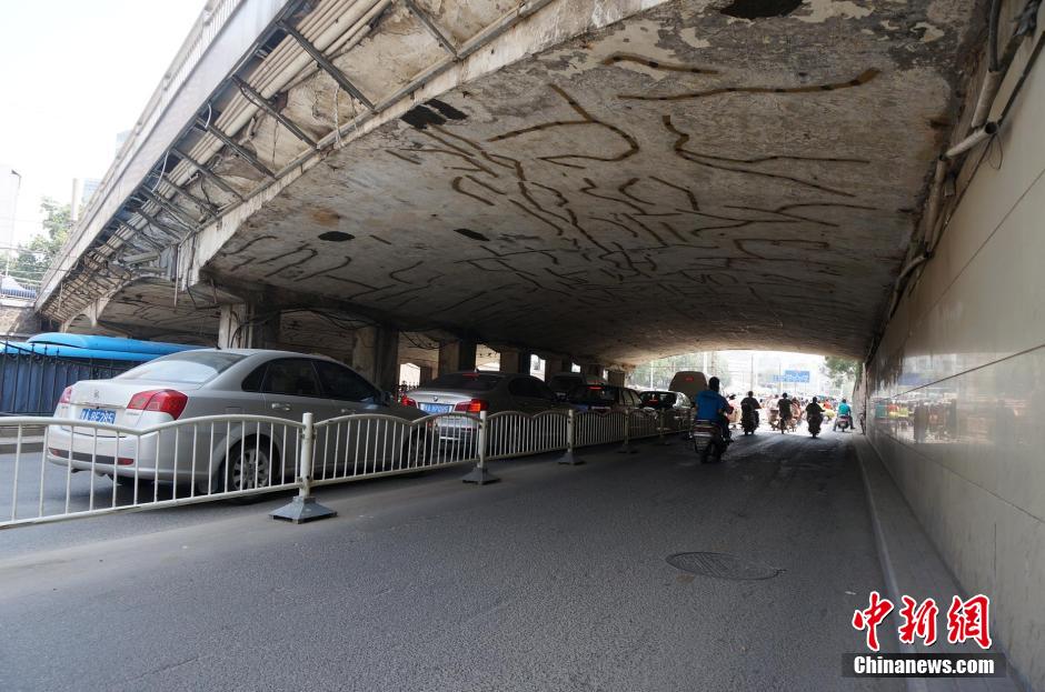 央廣網(wǎng)河南分網(wǎng)消息 據(jù)中新網(wǎng)報(bào)道:7月16日,記者現(xiàn)場(chǎng)看到,數(shù)百條“補(bǔ)丁”錯(cuò)綜復(fù)雜貼于橋底頂部,讓人眼花繚亂。該橋連接火車站與二馬路汽車站,每天都有大量汽車、行人從上面通過(guò)?匆(jiàn)這些“補(bǔ)丁”,過(guò)往市民稱,既然有問(wèn)題就得修,僅用補(bǔ)丁修復(fù)裂縫不靠譜,不知是否還存有安全隱患,從這走過(guò)著實(shí)讓人心慌。圖為鄭州二馬路跨正興街的馬路橋,橋底頂部布滿“補(bǔ)丁”。(周小云攝)