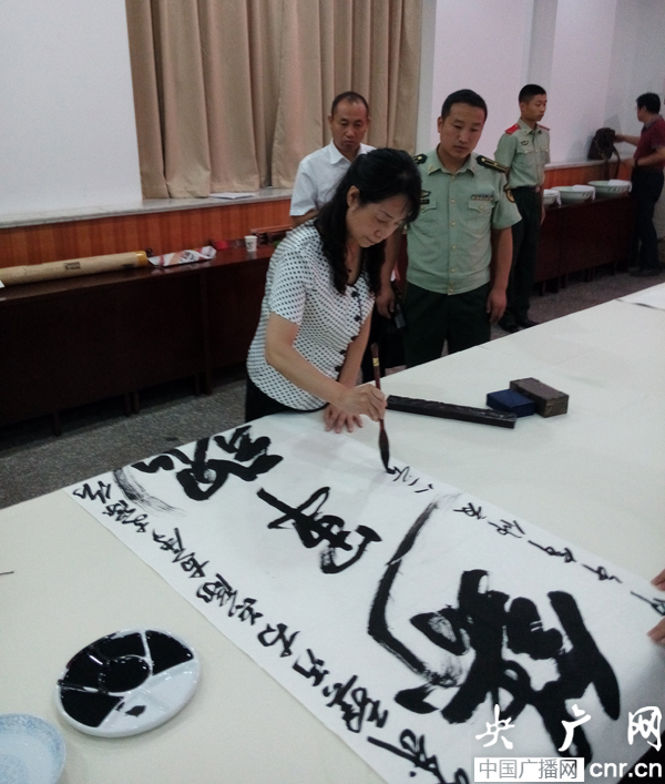 當天,河南省文聯的領導和藝術家們現場觀看了武警科目表演,參觀了部隊營房,詳細了解了戰(zhàn)士們平時的訓練和生活細節(jié)。深受感染的藝術家們當場揮毫創(chuàng)作,歌頌時代軍營,歌頌軍民情誼,軍地雙方以別開生面的方式,共同慶祝建軍節(jié)的到來。