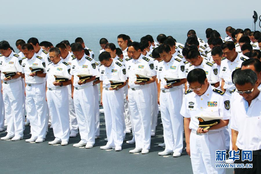 央廣網(wǎng)河南分網(wǎng)消息 據(jù)新華網(wǎng)報道:8月27日,汽笛長鳴,參加祭奠儀式的軍地領(lǐng)導(dǎo)和官兵代表脫帽低頭默哀1分鐘。當(dāng)日,海軍在威海劉公島海域舉行甲午戰(zhàn)爭120周年海上祭奠儀式。由導(dǎo)彈護(hù)衛(wèi)艦鹽城艦、臨沂艦、大同艦和1艘綜合保障船及2架艦載直升機(jī)組成的?站庩,分別向預(yù)定海域航渡。官兵在甲板分區(qū)列隊,在軍地領(lǐng)導(dǎo)和官兵代表嘹亮的國歌聲中,海上祭奠儀式開始。同一時刻,萬里海疆軍港內(nèi)的艦艇齊聲鳴笛,祭奠在甲午戰(zhàn)爭中為國捐軀的北洋海軍將士。新華社記者查春明攝