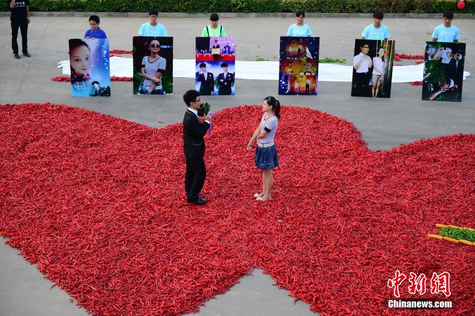 8月29日,河北省邯鄲市雞澤縣小伙兒豆子旺在一辣椒加工企業(yè)上演浪漫一幕,他用九萬九千九百九十九只紅辣椒擺成巨大“心”形,向心儀已久的女友表白求婚,讓在場的人們見證這一浪漫溫馨時(shí)刻。 中新社發(fā) 胡曉華 攝 圖片來源:CNSPHOTO