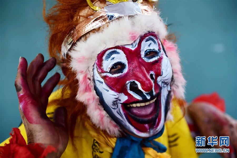 央廣網(wǎng)河南分網(wǎng)消息 81歲的“美猴王”何玉久是山東省桓臺(tái)縣人,16歲結(jié)緣“猴戲”,師從劉俊文、張恒貫等民間藝人。上世紀(jì)五六十年代,何玉久創(chuàng)新臉譜設(shè)計(jì),把“倒栽桃形”與“橄欖形”結(jié)合起來,將眼窩從十字形改為濃眼圈加眉子,增添了“美猴王”的武生氣質(zhì)。為了將“猴戲”和自己的本領(lǐng)傳承下去,2013年起,何玉久受聘于桓臺(tái)縣馬橋鎮(zhèn)陳莊小學(xué),開設(shè)“猴戲”特長輔導(dǎo)班,免費(fèi)為感興趣的孩子講授“猴戲”。新華社記者郭緒雷攝