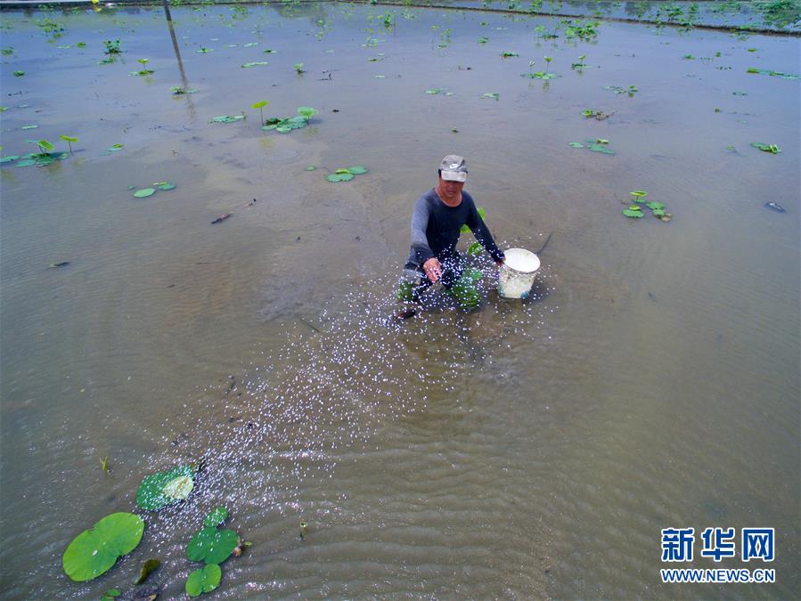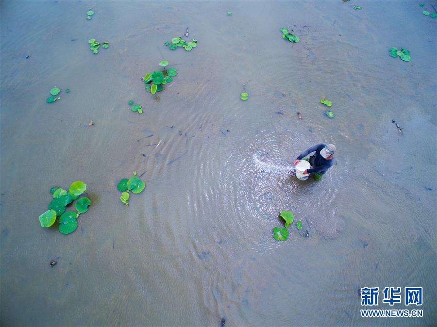 5月5日,福州市閩侯縣南通鎮(zhèn)曹浦村村民為藕田施肥。