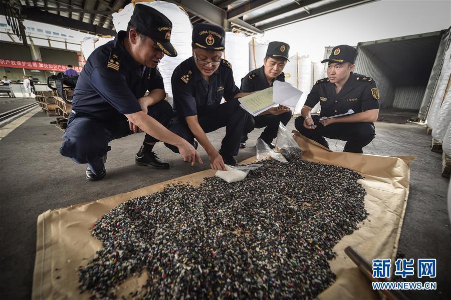 圖為6月2日,深圳海關(guān)工作人員拆開包裝,展示查獲的偷運入境的固體廢棄物。 新華社記者 毛思倩 攝 圖片來源:新華網(wǎng)