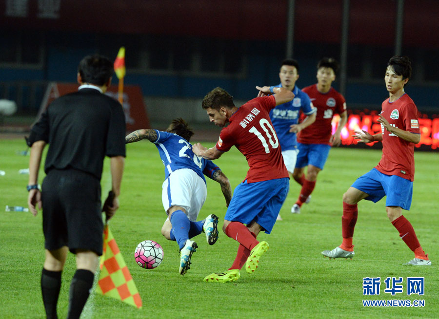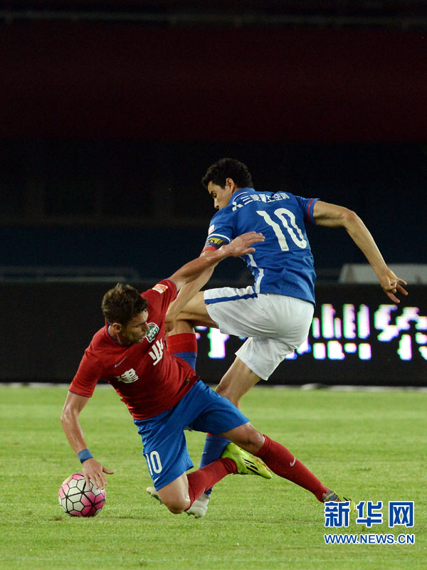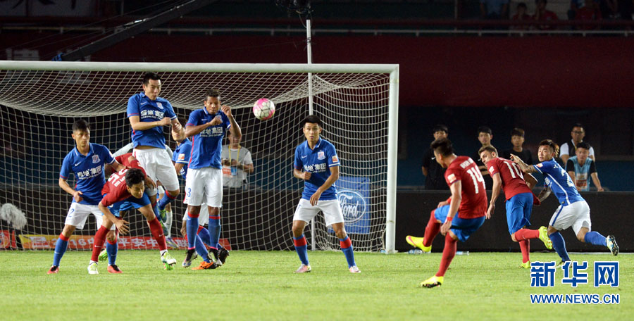 6月11日,河南建業(yè)隊14號買提江主罰任意球。 當日,中超聯(lián)賽第12輪河南建業(yè)主場對陣上海申花的比賽打響,最終,雙方上半場各進一球,上海申花與河南建業(yè)握手言和。 新華網(wǎng)發(fā)(王曉飛攝)