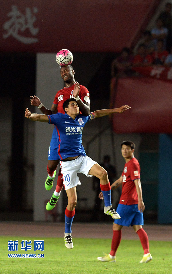 6月11日,雙方球員在比賽中拼搶頭球。 當日,中超聯(lián)賽第12輪河南建業(yè)主場對陣上海申花的比賽打響,最終,雙方上半場各進一球,上海申花與河南建業(yè)握手言和。 新華網(wǎng)發(fā)(王曉飛攝)