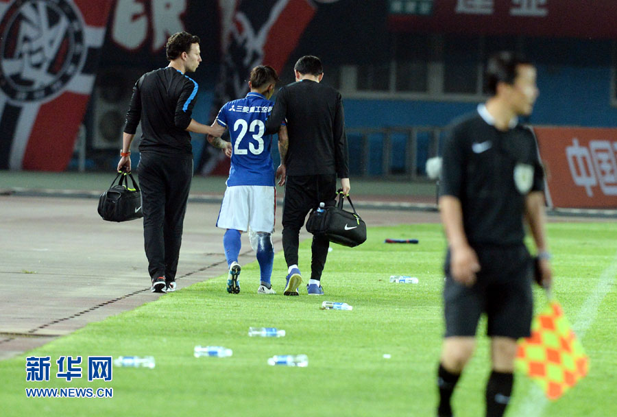 6月11日,上海申花隊球員柏佳駿受傷離場。 當日,中超聯(lián)賽第12輪河南建業(yè)主場對陣上海申花的比賽打響,最終,雙方上半場各進一球,上海申花與河南建業(yè)握手言和。 新華網(wǎng)發(fā)(王曉飛攝)