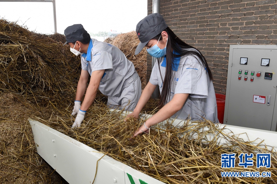 6月11日,河南碧海生物科技有限公司宜陽秸稈處理中心的工作人員將秸稈放入粉碎機(jī)處理。
