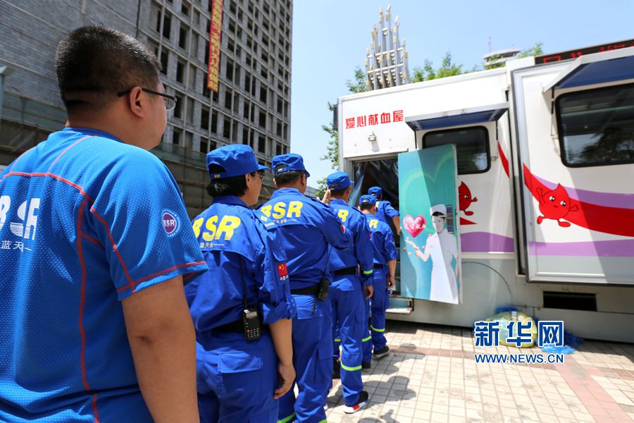 2016年6月14日,河南安陽(yáng)老市政廣場(chǎng)愛(ài)心獻(xiàn)血屋,來(lái)自安陽(yáng)、林州藍(lán)天救援隊(duì)的隊(duì)友排長(zhǎng)隊(duì)參與無(wú)償獻(xiàn)血。