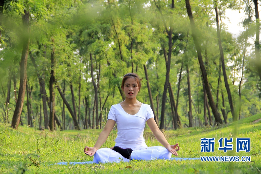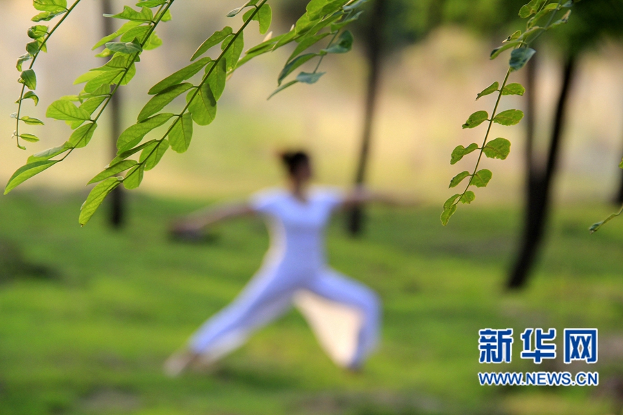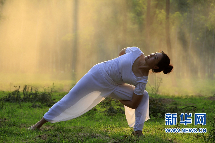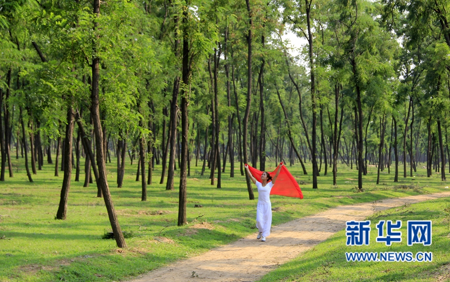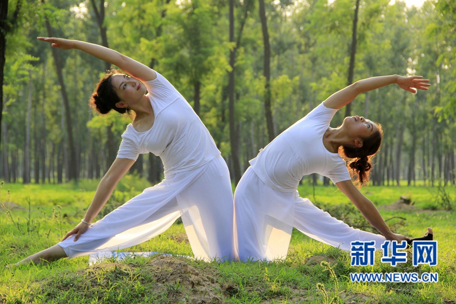 夏至?xí)r節(jié),河南省內(nèi)黃縣瑜伽愛好者走進(jìn)槐林深處,在樹蔭下舒展身心,靜享清涼。新華網(wǎng)發(fā)(劉肖坤
